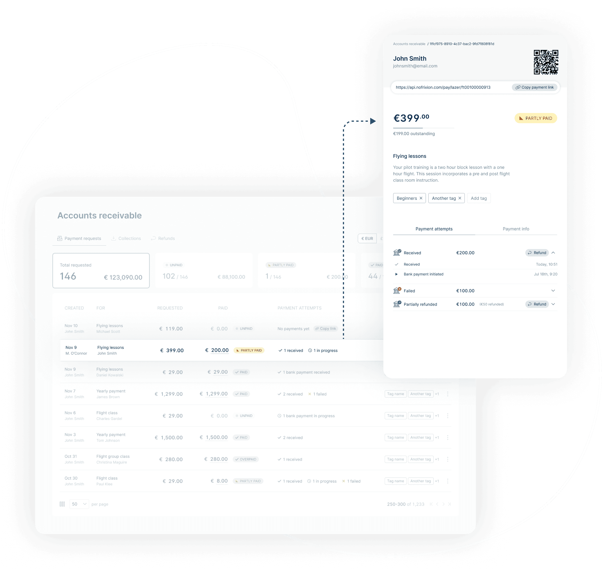 Create branded payment links with single or partial payments, custom labels, and status notifications.